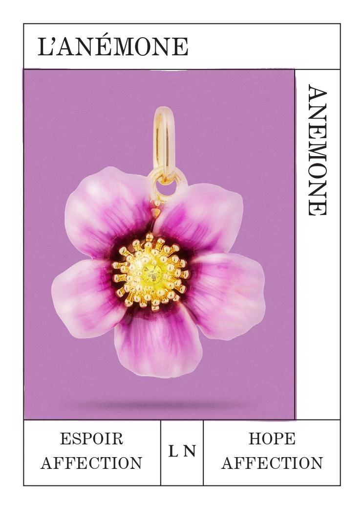 Pendentif anémone émaillé à la main et coloré d’un léger dégradé de violet.