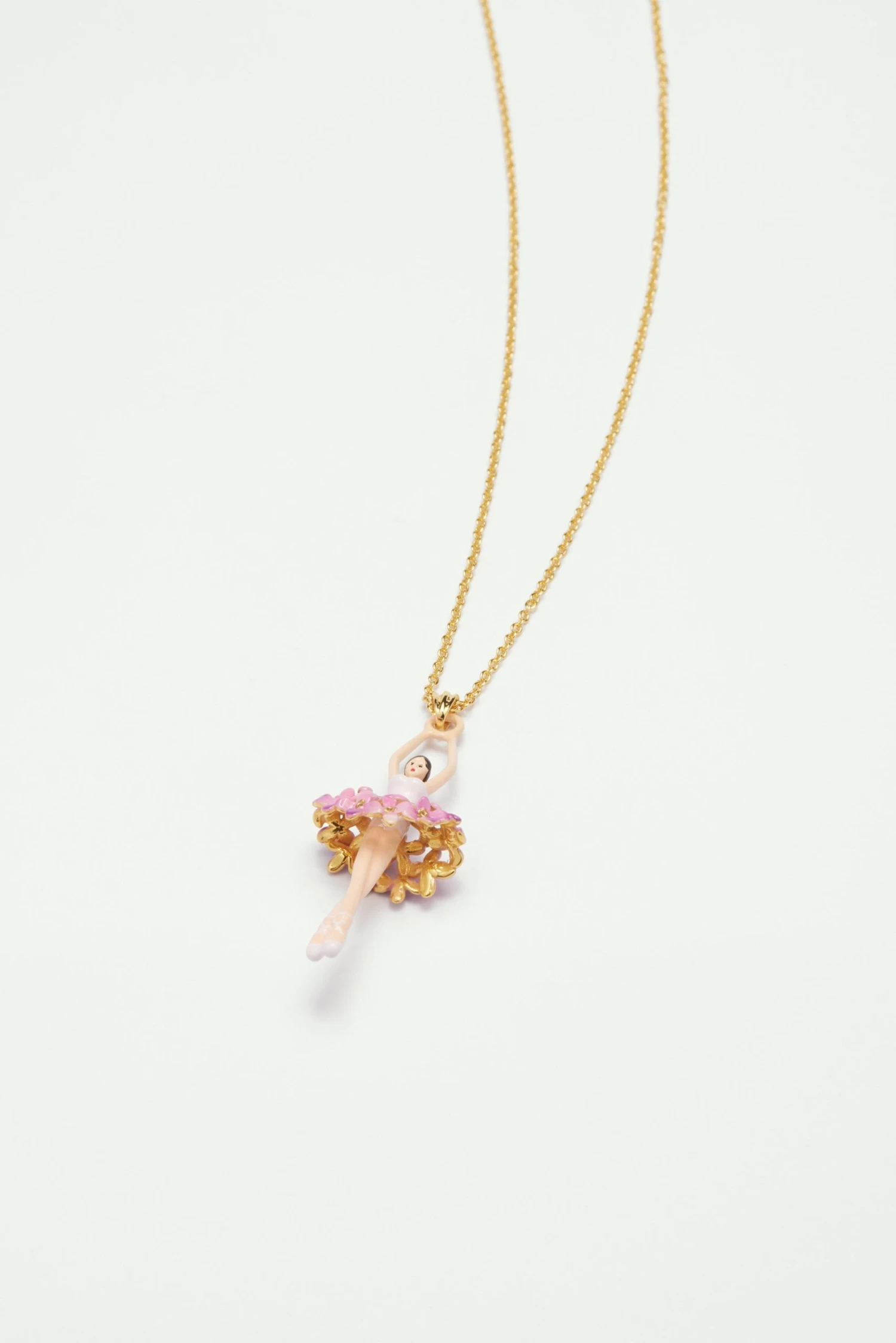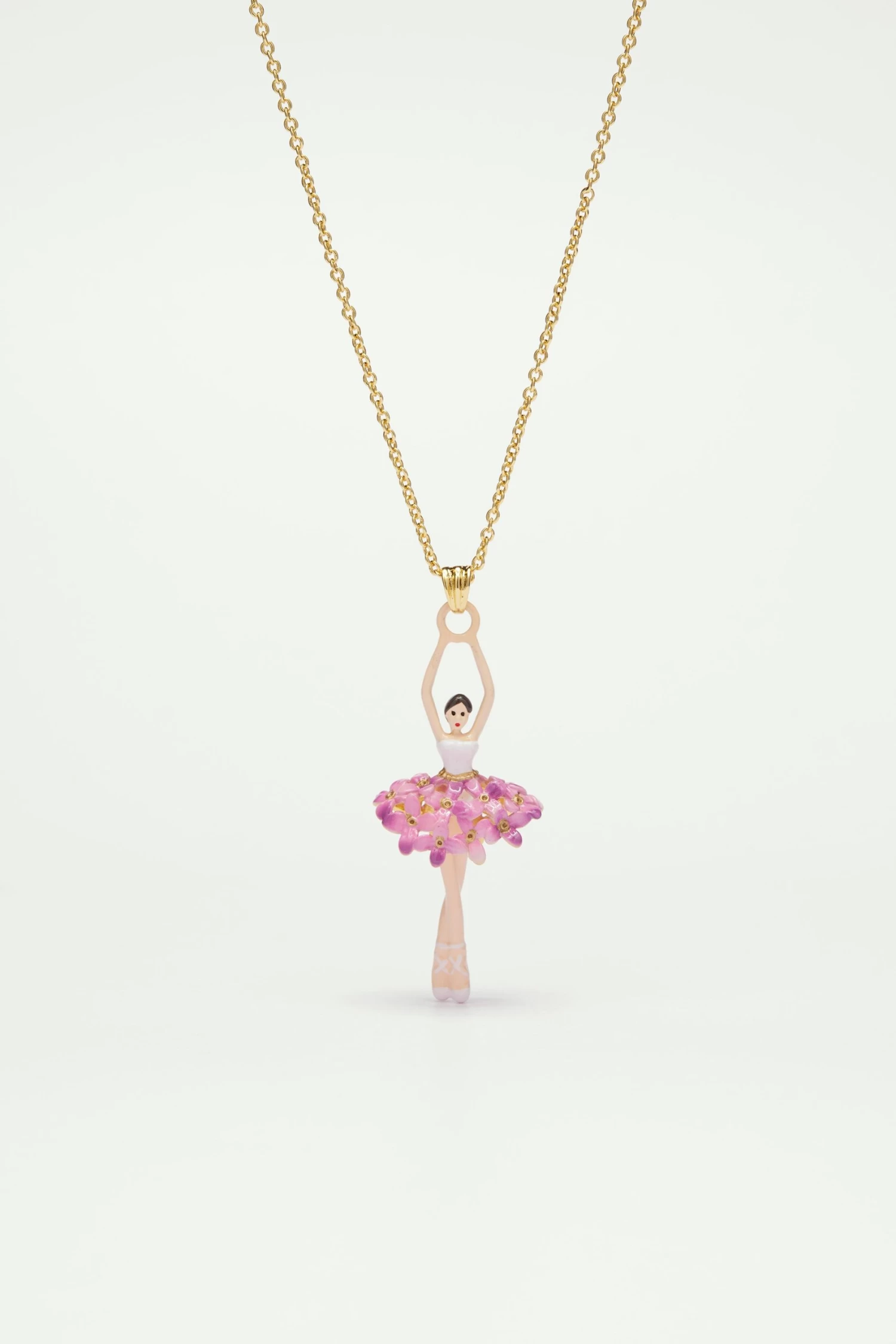 Collier avec pendentif ballerine, jupon formé par plusieurs fleurs de lilas roses, chaine en laiton doré à l’or fin.