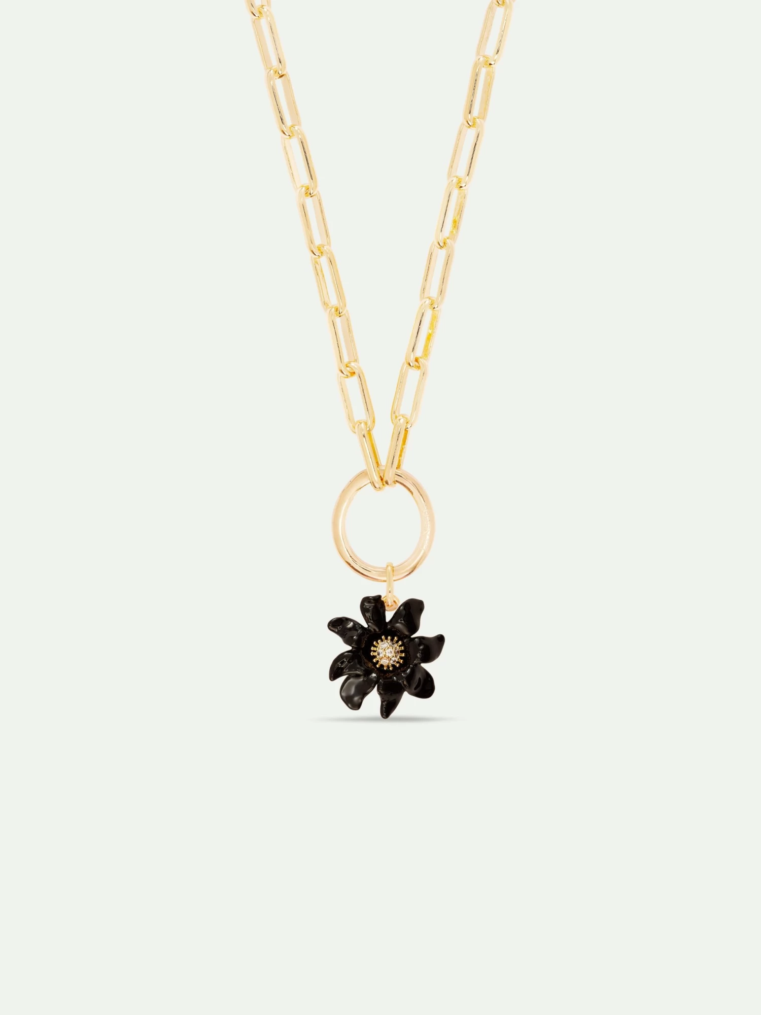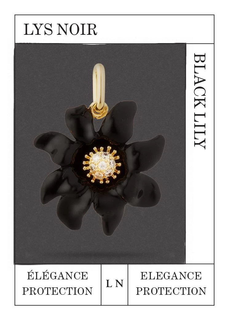 Pendentif fleur de lys noir émaillé à la main et orné d’oxydes de zirconium en son centre.