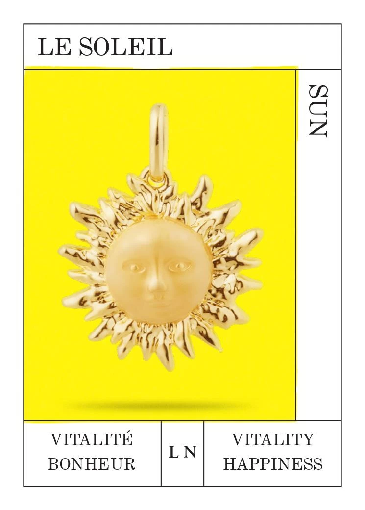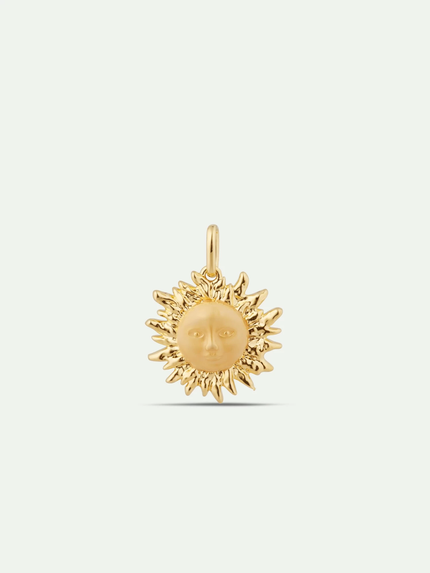 Pendentif soleil émaillé à la main et présentant un visage en son centre.