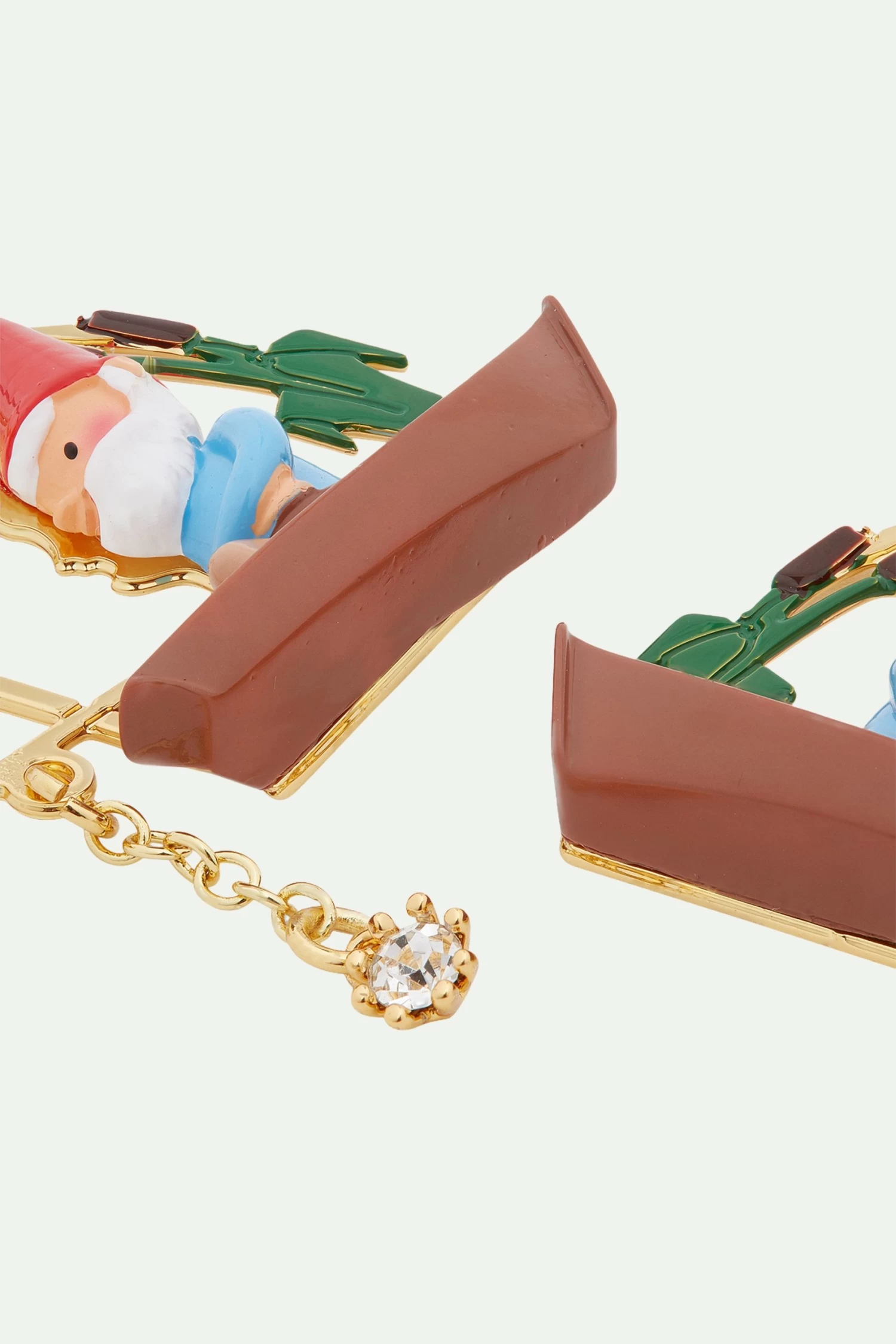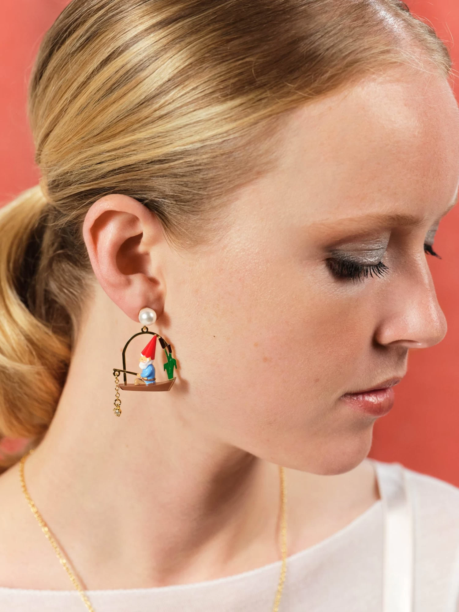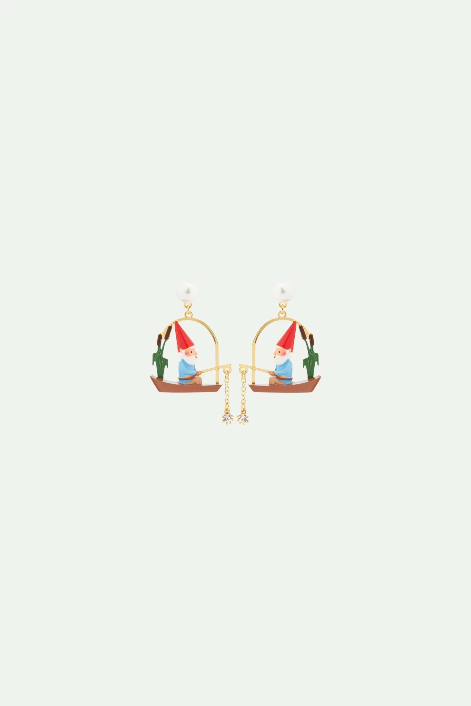 Une petite balade en bateau accompagnée d’une séance de pêche s’impose sur cette paire de boucles d’oreilles haute fantaisie. Accompagnez le nain de jardin de la famille Champimignon dans cette escapade en bateau. Habillé de ses charmants vêtements colorés et de son chapeau rouge, ce nain aussi attachant que mignon se sert d’une magnifique chaîne dorée à l’or fin au bout de laquelle est suspendu un cristal facetté pour pêcher. Sublimez vos oreilles avec ce bijou de créateur signé N2 by Les Néréides. Boucles d’Oreilles Clip : Laiton doré à l’or fin, émaillé à la main, chaîne et perle fantaisie.