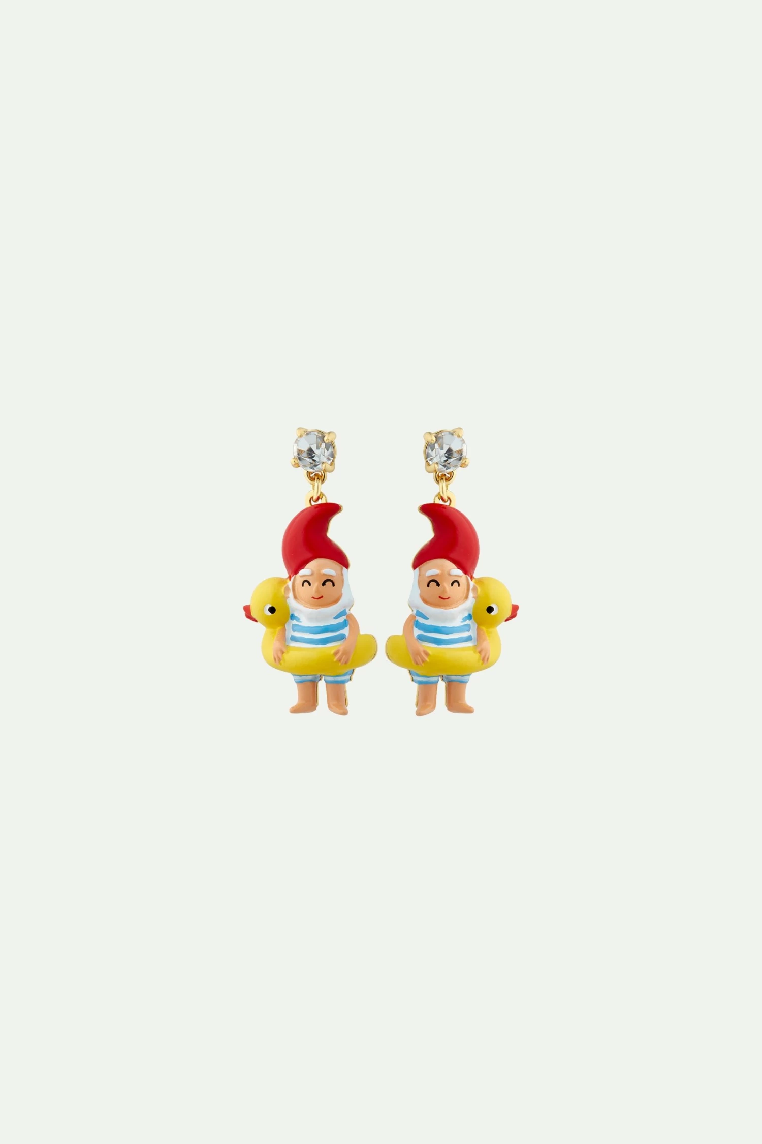 Boucles d’oreilles tiges, nain de jardin et bouée canard délicatement émaillés à la main, ornées d’un cristal.
