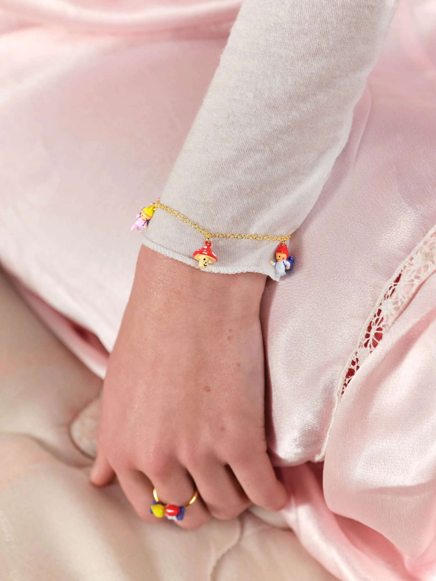 Sur ce bracelet charm’s, accrochés à une magnifique fine chaîne dorée à l’or fin, retrouvez les enfants de la famille Champimignon. Ici, ils sont accompagnés d’un petit champignon rouge au centre de la pièce qui arbore un sourire à la fois malicieux et adorable. Laissez ce bijou de créateur vous porter chance en habillant votre poignet de son originalité sans pareil. Bracelet Fin : Laiton doré à l’or fin, émaillé à la main, charm’s et chaîne.