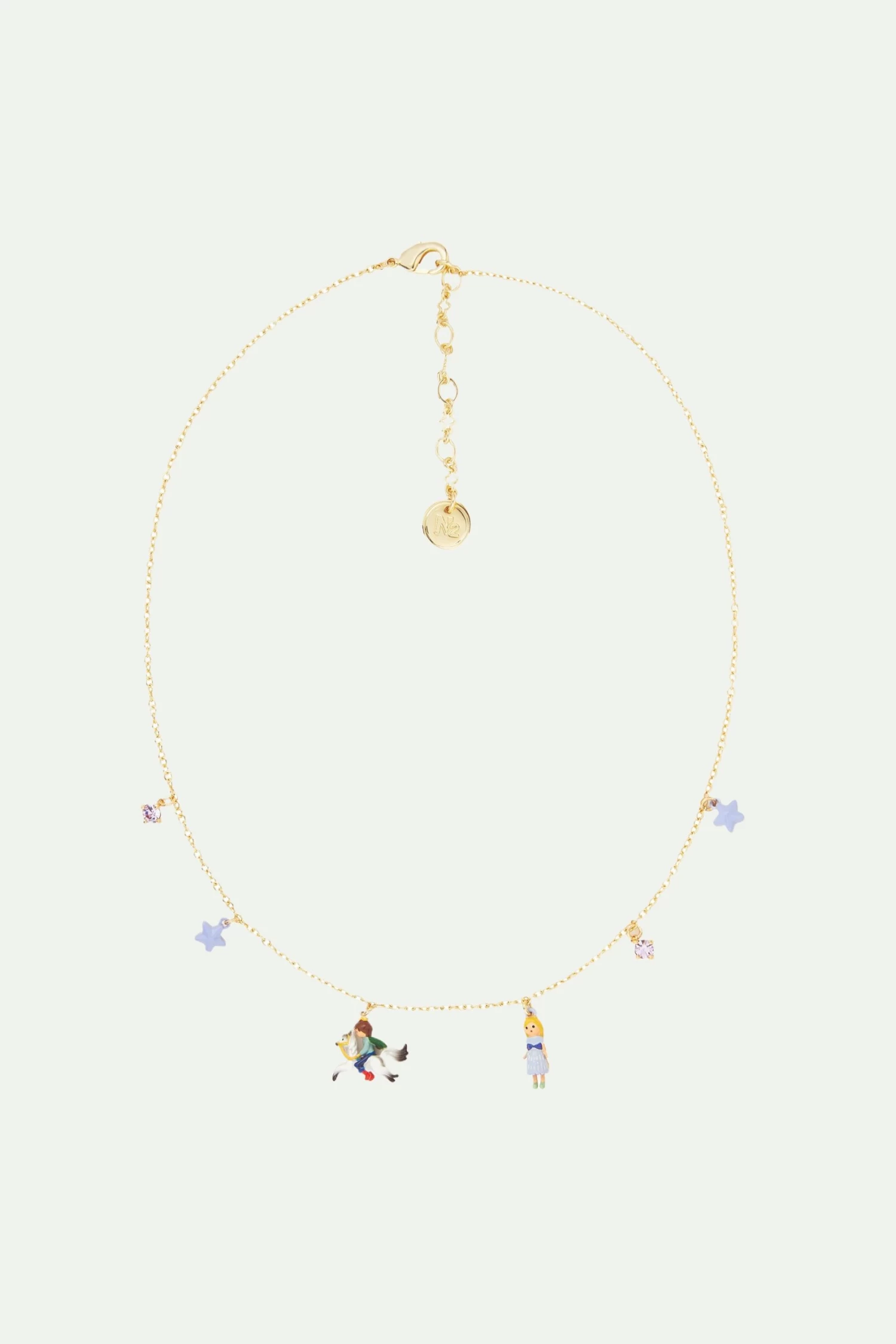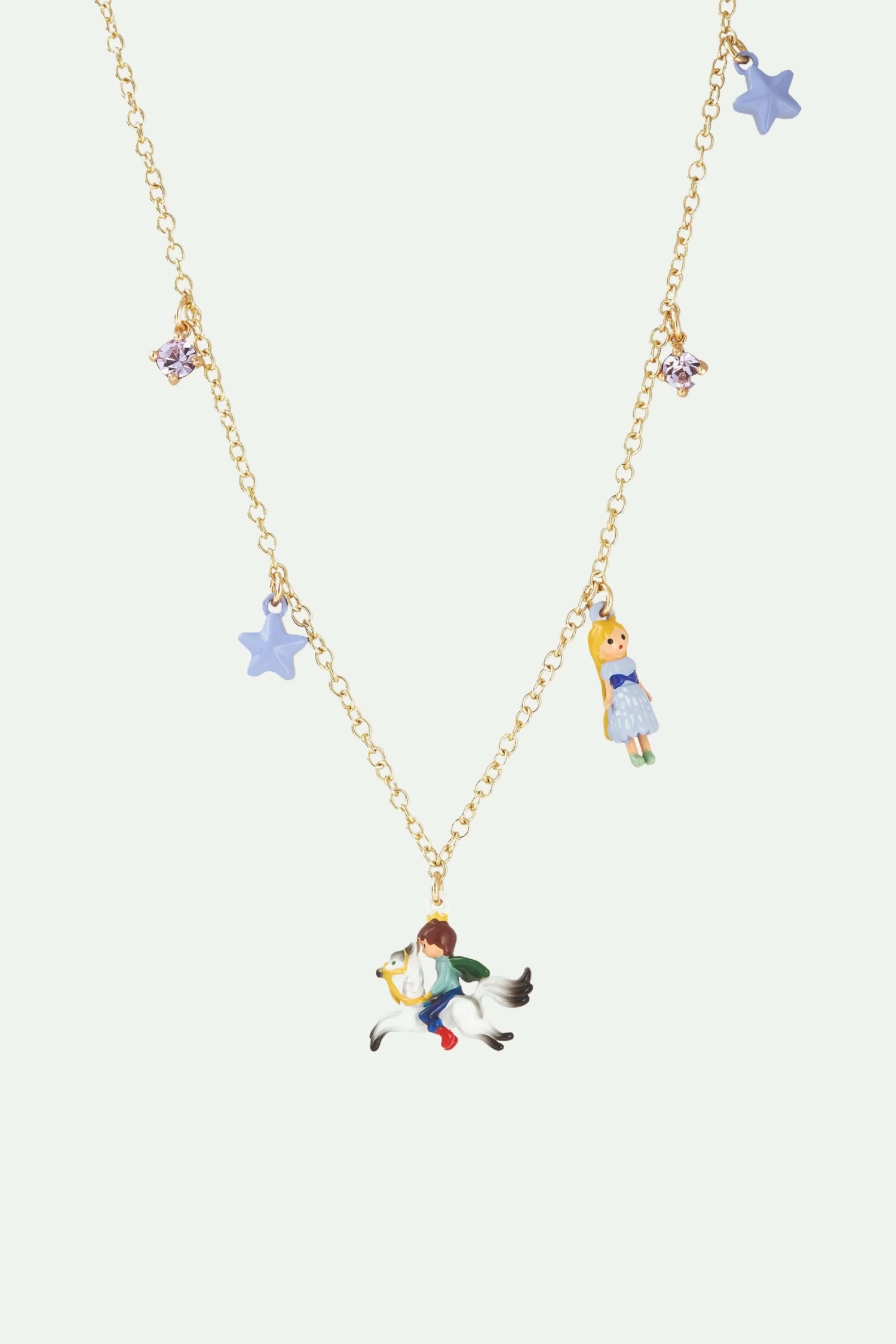 Prisonnière d’une méchante sorcière, Raiponce guette la venue de celui qui saura la sauver. Le prince charmant sur son beau cheval blanc arrivera-t-il à la délivrer de son donjon ? Les longs cheveux dorés et le pouvoir d’un amour véritable seront la clé d’un heureux dénouement. Magie, natte enchantée et fier héros sur son destrier sont tous présents dans cette collection conte de fée signée N2. Collier Pendentif : Laiton doré à l’or fin, cristal facetté serti griffe et fine chaîne dorée.