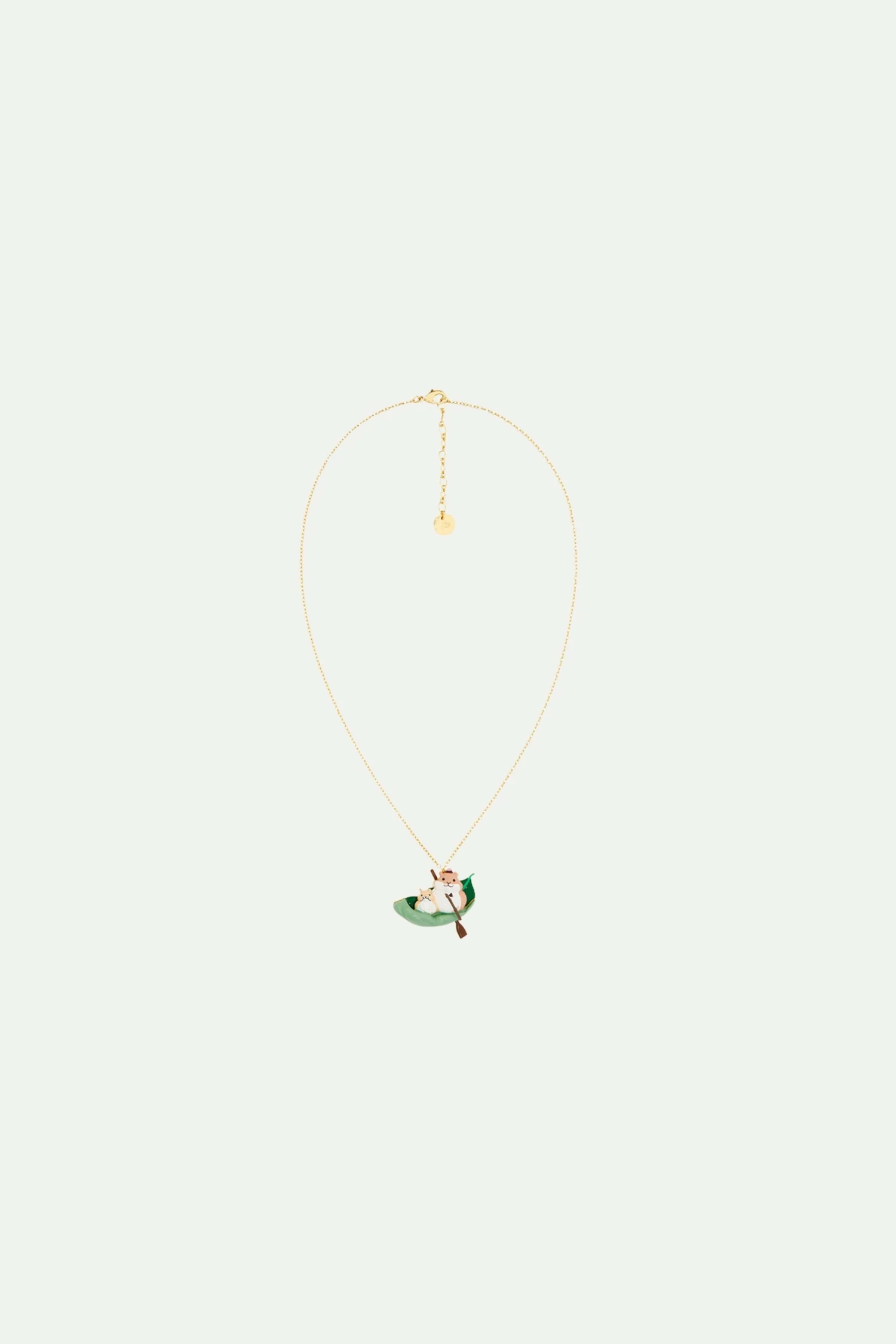 Collier pendentif, hamsters explorateurs à bord d’une barque en forme de feuille, minutieusement émaillés à la main, perles dorées à l’or fin.