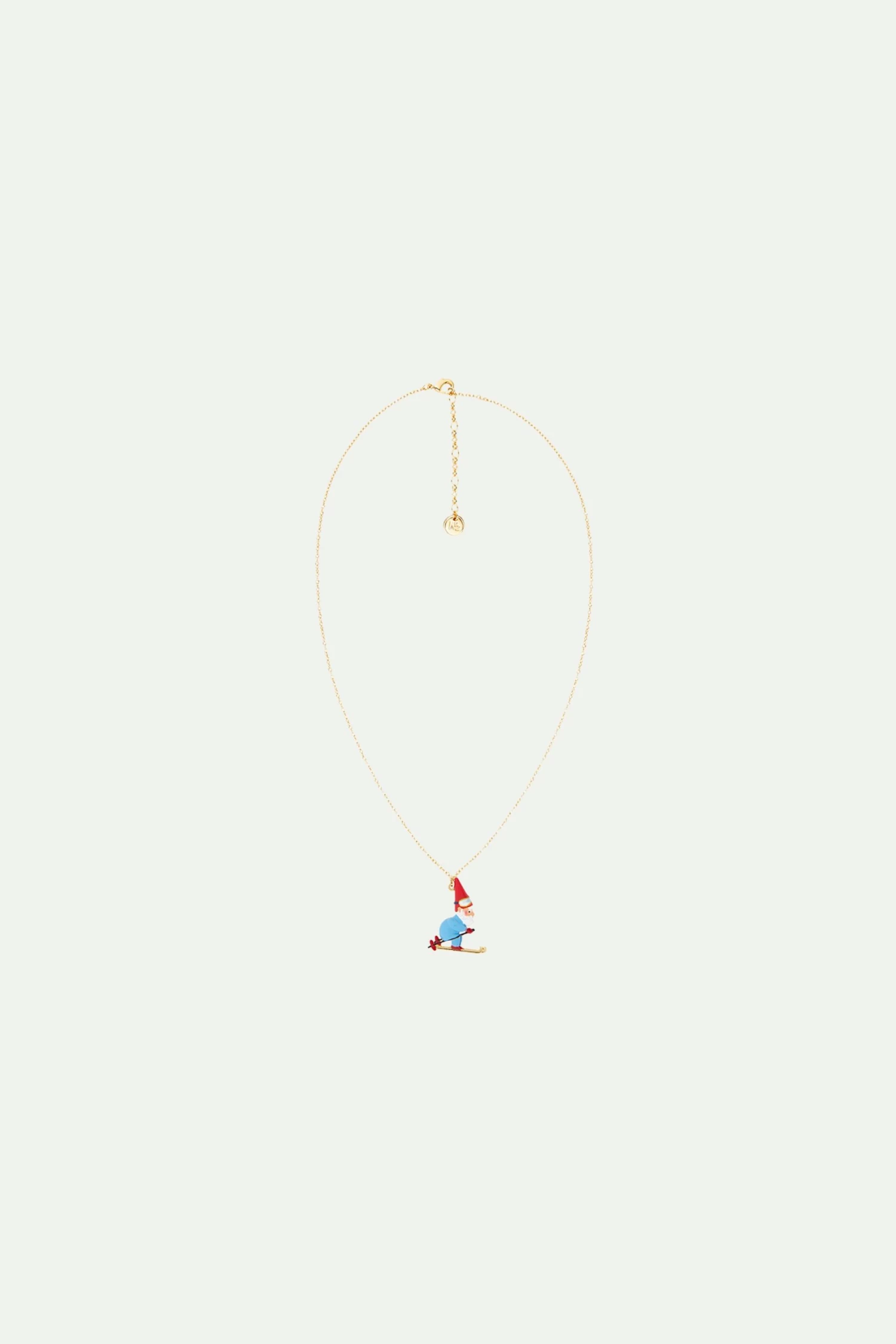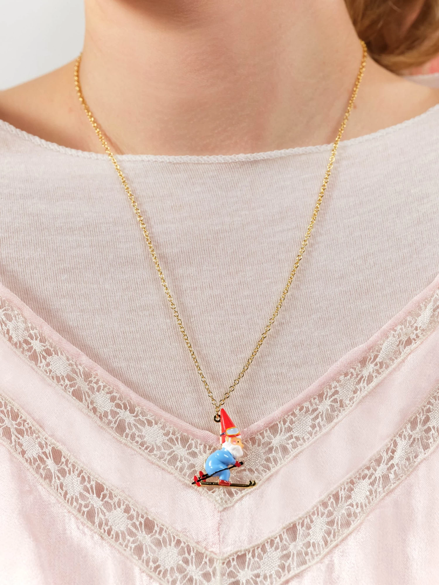 Découvrez le patriarche de la famille Champimignon qui est la vedette de ce collier plastron haute fantaisie. Vêtu de sa plus belle combinaison bleue et de ses skis, il démontre ses prouesses de skieur tout en éveillant l’admiration de sa joyeuse famille de nains de jardin. Allez à l’aventure avec ce bijou raffiné, qui vous permet d’apporter un brin de l’ambiance ludique et charmante des Champimignon où que vous soyez. Collier Pendentif : Laiton doré à l’or fin, émaillée à la main et fine chaîne dorée.