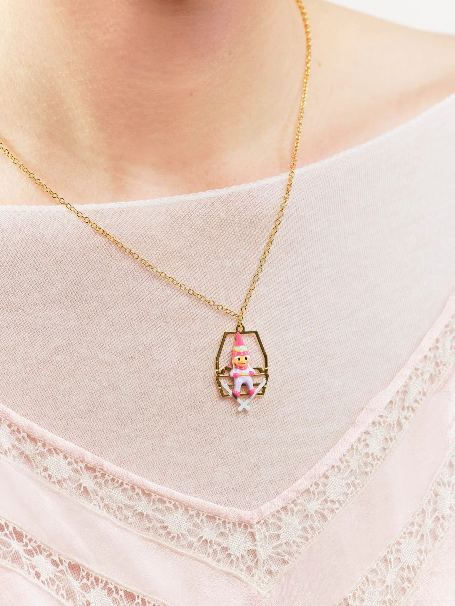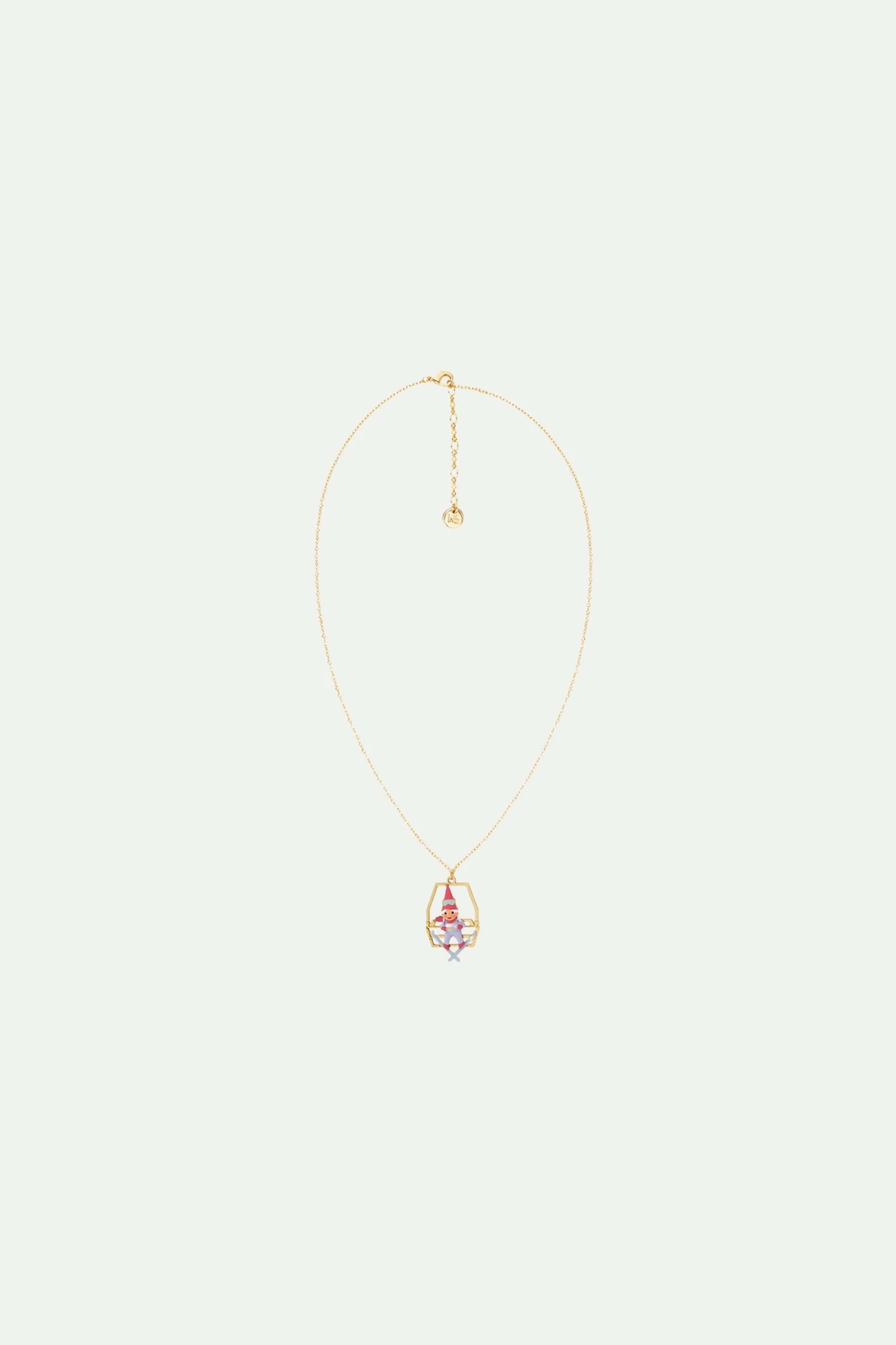 Sur ce collier pendentif, retrouvez la joyeuse naine de jardin de la famille Champimignon. Habillée d’une combinaison violette, de ses skis et de son bonnet rouge, elle est assise au fond de son télésiège qui la transporte au sommet d’une colline enneigée. Impatiente de dévaler la pente à toute allure, elle admire la magnifique vue sur la forêt enneigée tout en arborant un sourire contagieux. Adoptez cette adorable naine de jardin pour décorer votre cou de son originalité signée N2 by Les Néréides. Collier Pendentif : Laiton doré à l’or fin, émaillée à la main et fine chaîne dorée.