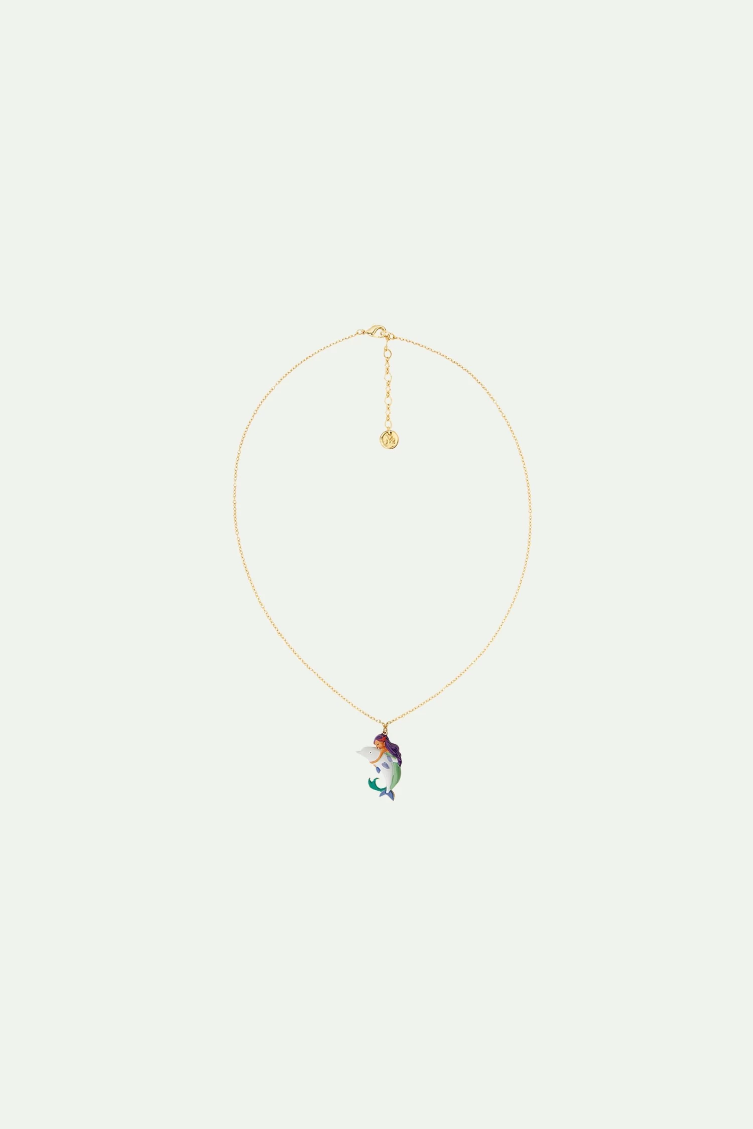 Collier pendentif, petite sirène sur le dos de son ami le dauphin, délicatement émaillé à la main, doré à l’or fin, orné d’une perle nacrée. La Maison Les Néréides réinvente le conte de La Petite Sirène et ses nombreux amis les dauphins, hippocampes et autres étoiles de mer.