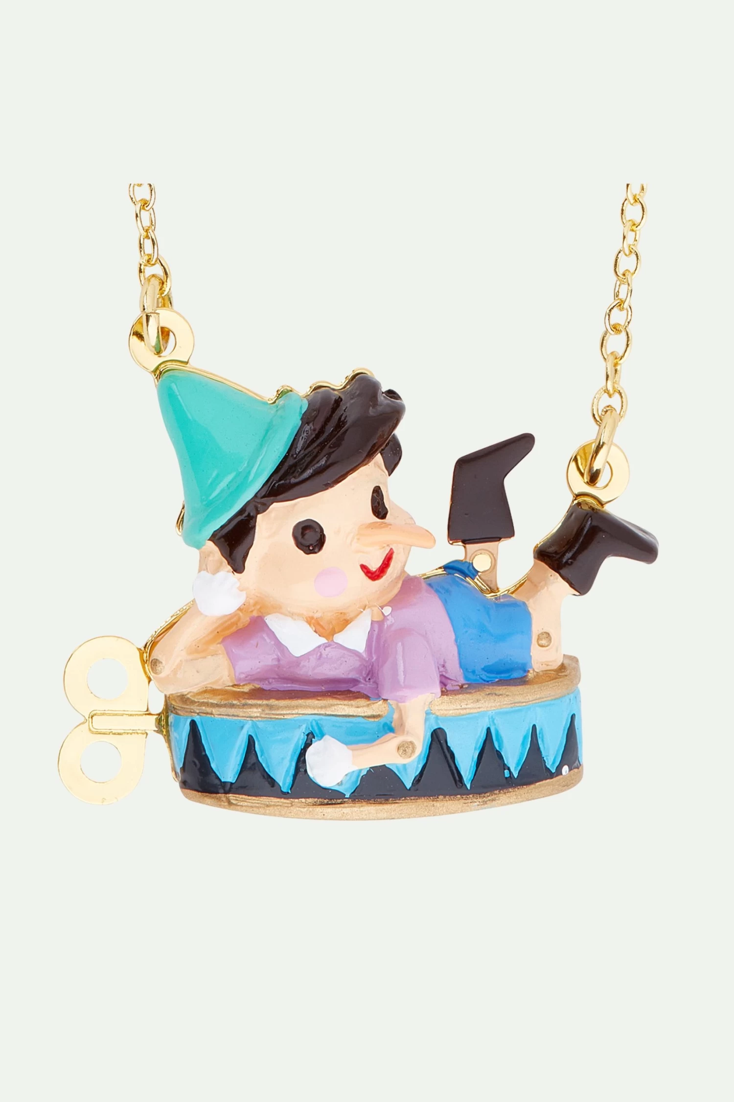 Ce collier d’une douceur infinie, issu de la collection Il Piccolino vous ramène en enfance. Le célèbre pantin de bois adoptant une pose décontractée se prend à rêvasser sur sa boîte à musique en forme de chapiteau. Pour obtenir la parure complète vous pouvez associer ce bijou aux boucles d’oreilles marionnette Pinocchio. Collier : Laiton doré à l’or fin, émaillé à la main.